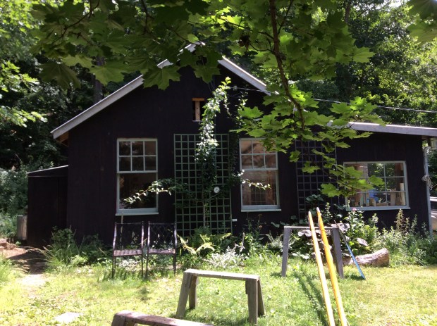 The shop they built has a roof that swoops down around a strip of plastic skylight and then shoots forward like a pouty lip. The outside is painted black, surprisingly elegant, rustic and profound like classic chalkboards. The New York spring greenery lends life to the dark walls, proving that black is inherently neutral, enhancing whatever mood surrounds it.