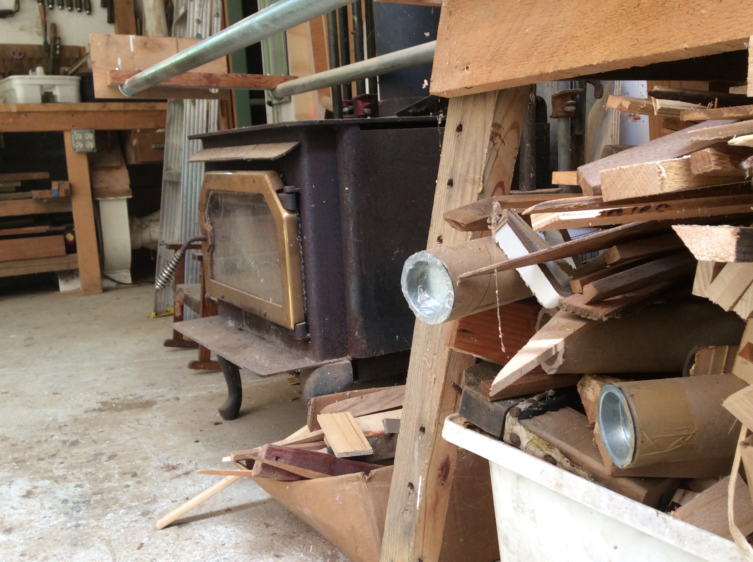 The floor is a single pad of concrete, rough and stained with paints and spots of epoxy dried into little lumps. Piles of sawdust leak from the base of the table saw and planer, to be swept and collected, the perfect cover material for the shitbucket. A wood stove in the corner sits surrounded by piles of wood scraps to burn; oak, walnut, and mahagony chunks that I secretly hoard as I clean, saving for future undetermined projects. I have only ever worked with pine lumber salvaged from construction site dumpsters. Quality wood seems like gold to me.