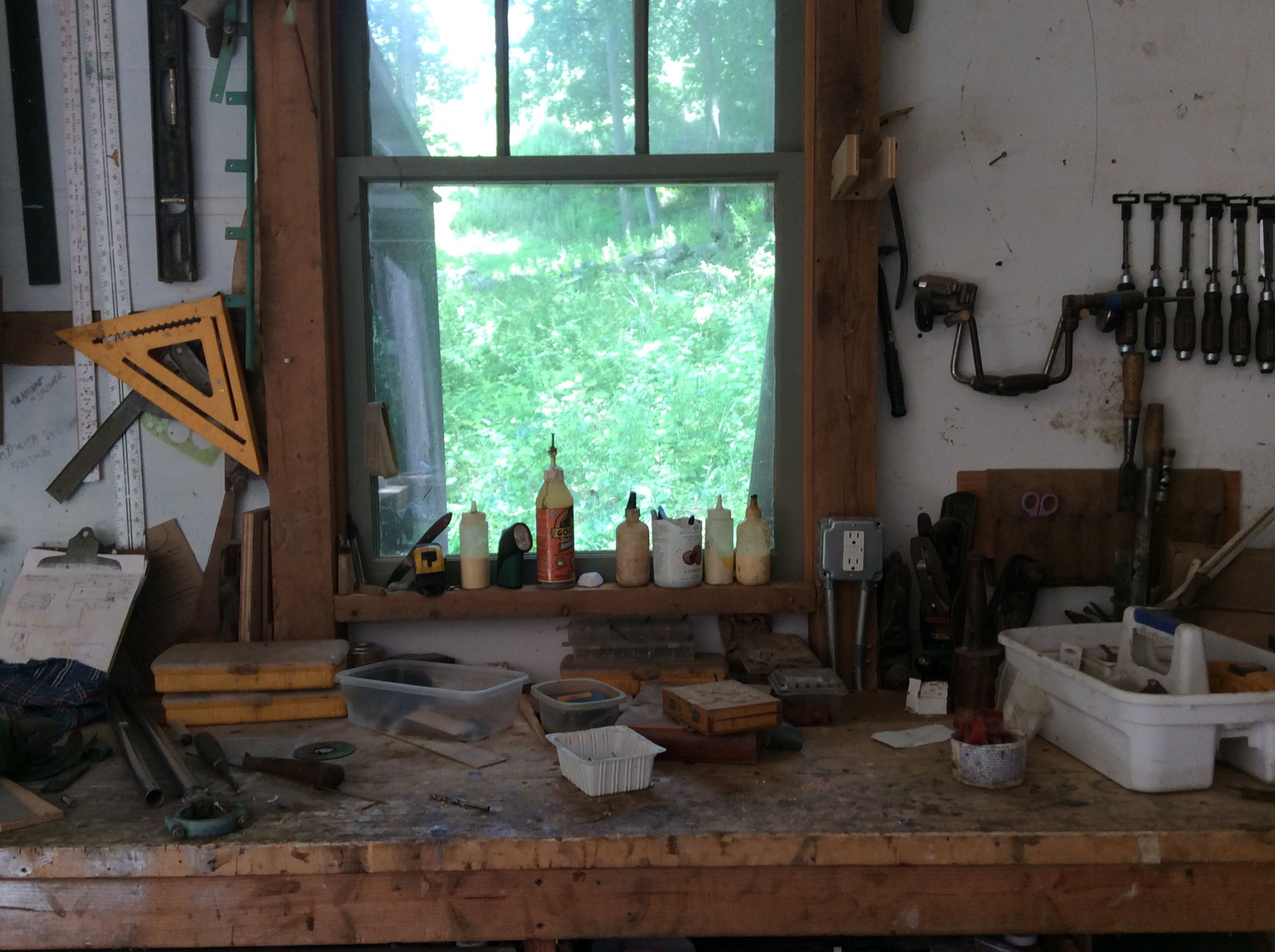 I watch him from the house sometimes, through one of the shop’s big windows, as he paces around the work benches, choosing from his stash of lumber, his rack of clamps, his sashes of chisels. I can hear his mood in the sound of the power tools. Loud, high-pitched if he’s angry, slow and precise when he’s relaxed, focused, enjoying creating. Ups and downs, love and hate, this is his craft, his element. And this is his shop.