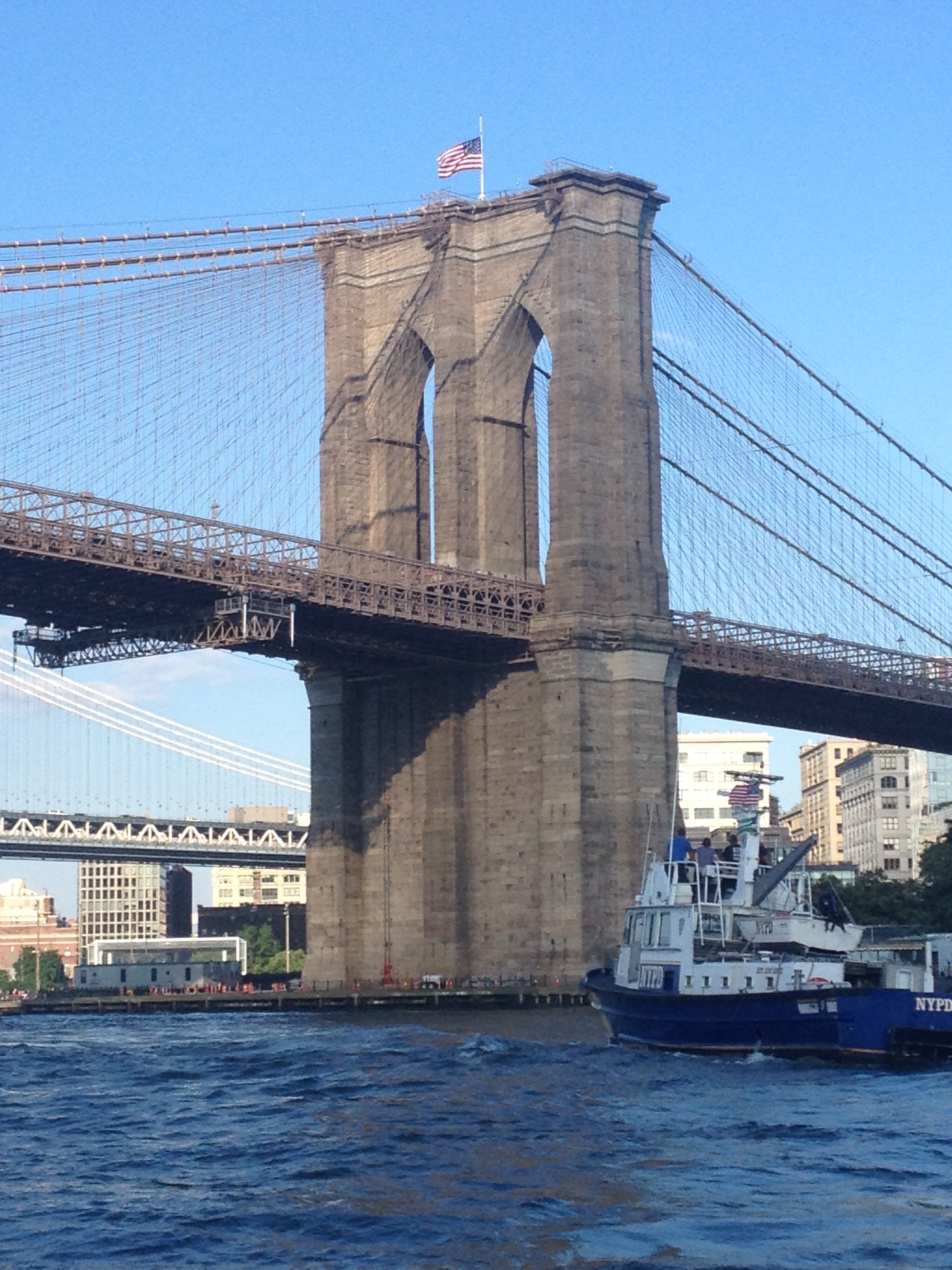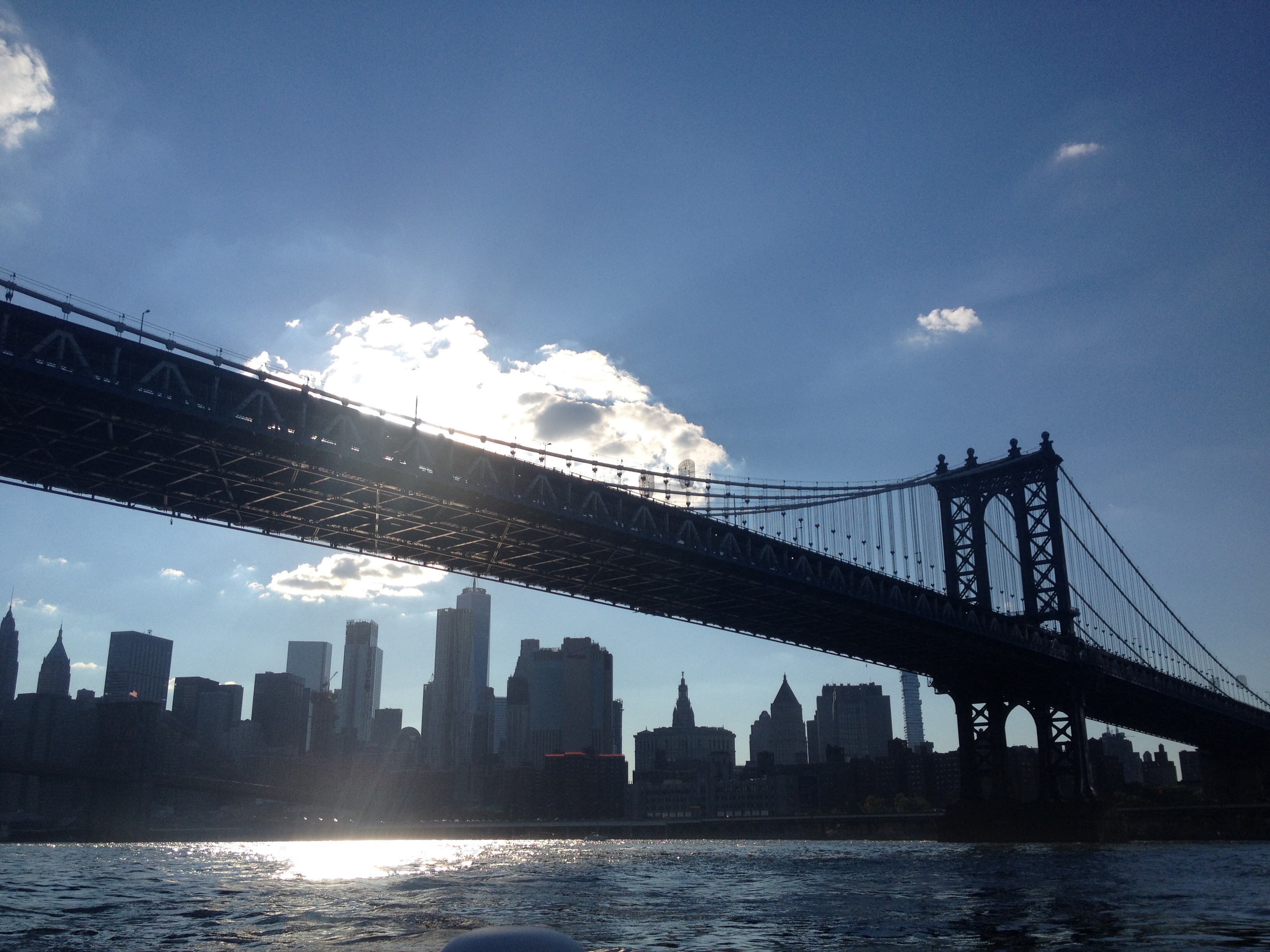 Our mast  tickled the underbellies of gigantic bridges, linking the various islands of the great wet city. The Tappen Zee Bridge, the George Washington, Brooklyn Bridge, Manhattan, Williamsburg, Queesnborough. As we passed far below the thundering traffic, I asked which was which of my native New Yorkers, receiving in return some history, some toll information, and opinions on the most recent rebuild or renovation. The sun set behind the skyline as we left the city behind.