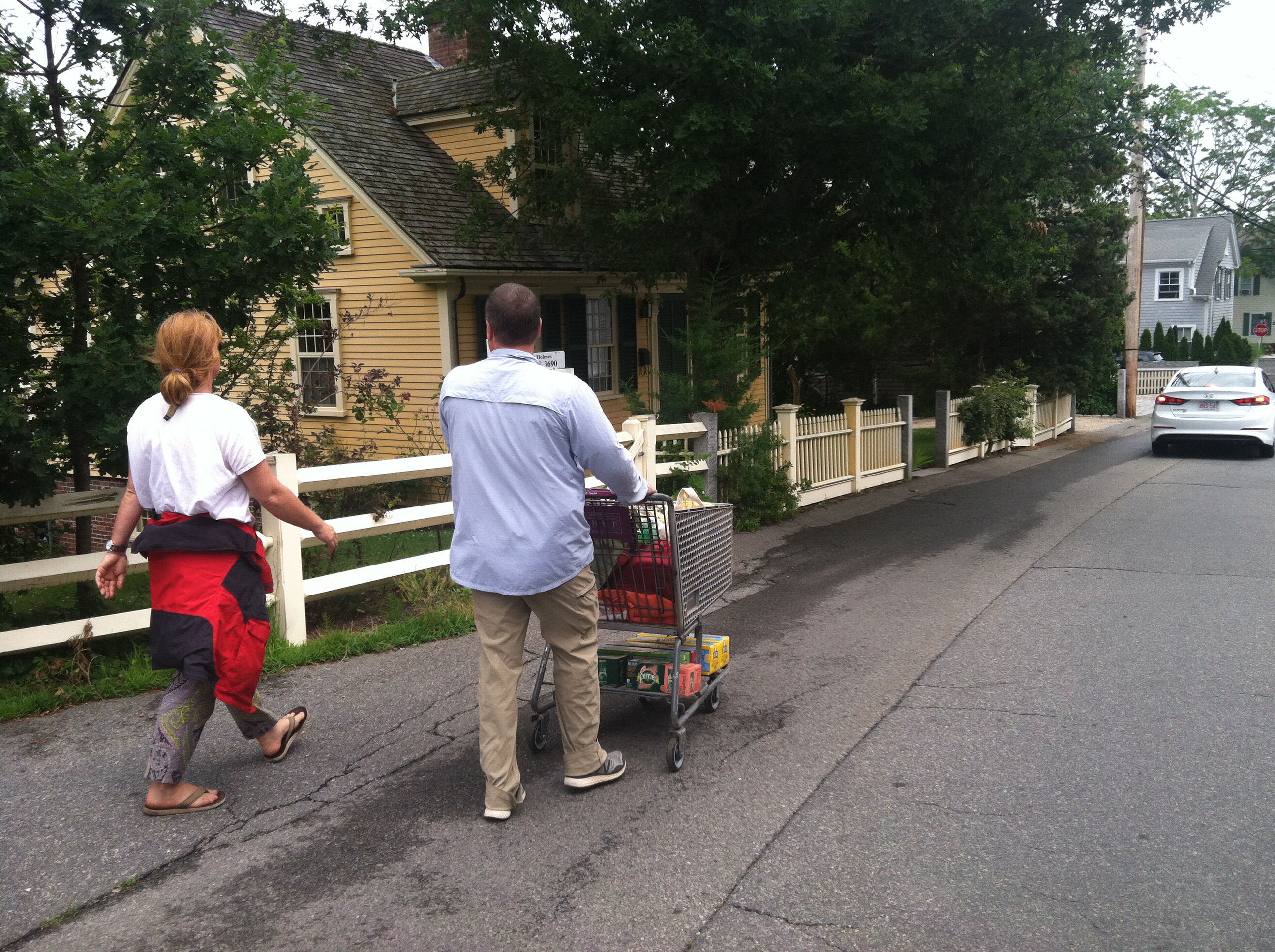 We did some last minute food shopping at the Stop & Shop up the road. One problem was that none of the advertised cab companies would answer to take us back to the boat. So Peter just set off down the road with the cart. “We’ll bring it back!” He lawyered, and we walked through town to the docks.