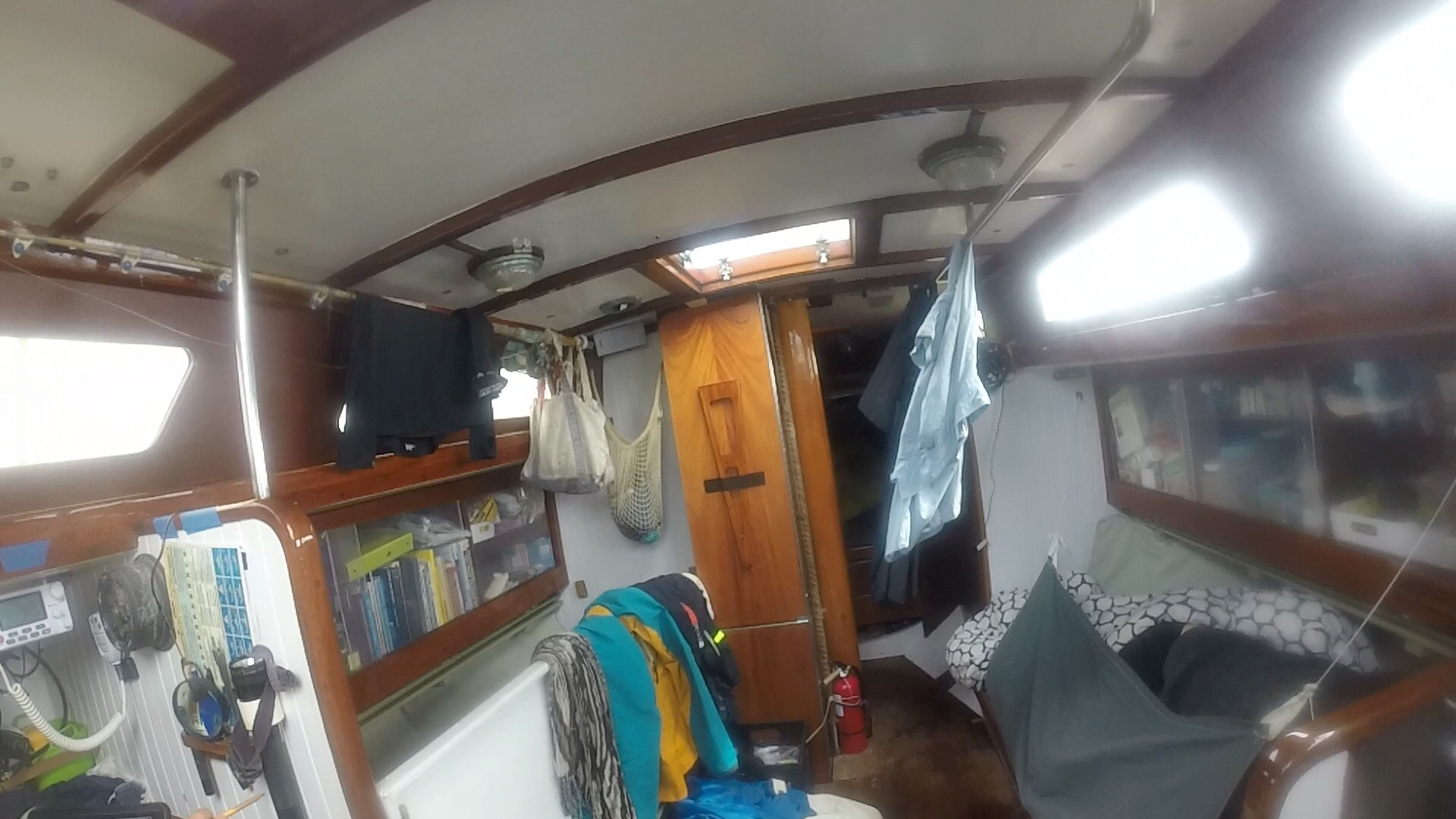 Inside it is cozy but jarring. Wet clothes drip onto wet floorboards. Pant legs and jacket arms reach out into space and fall limp after each roll, as if trying to grab onto something stable. Peter and Dana are tucked in their bunks, probably not asleep. I just came off watch, stripped my soaking pants, draped them strategically over my leeboard, and gratefully crawled in to radiate heat into the feathers of my duvet.