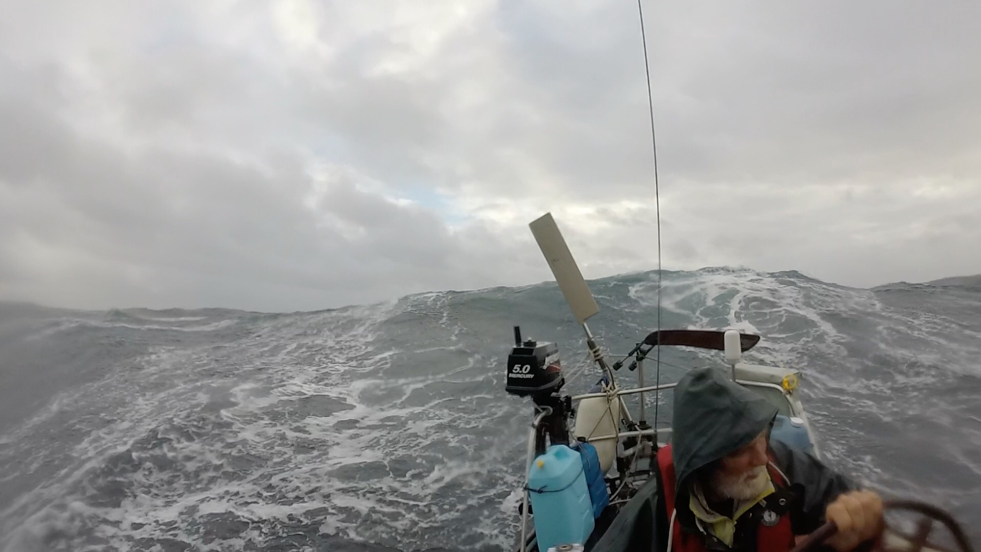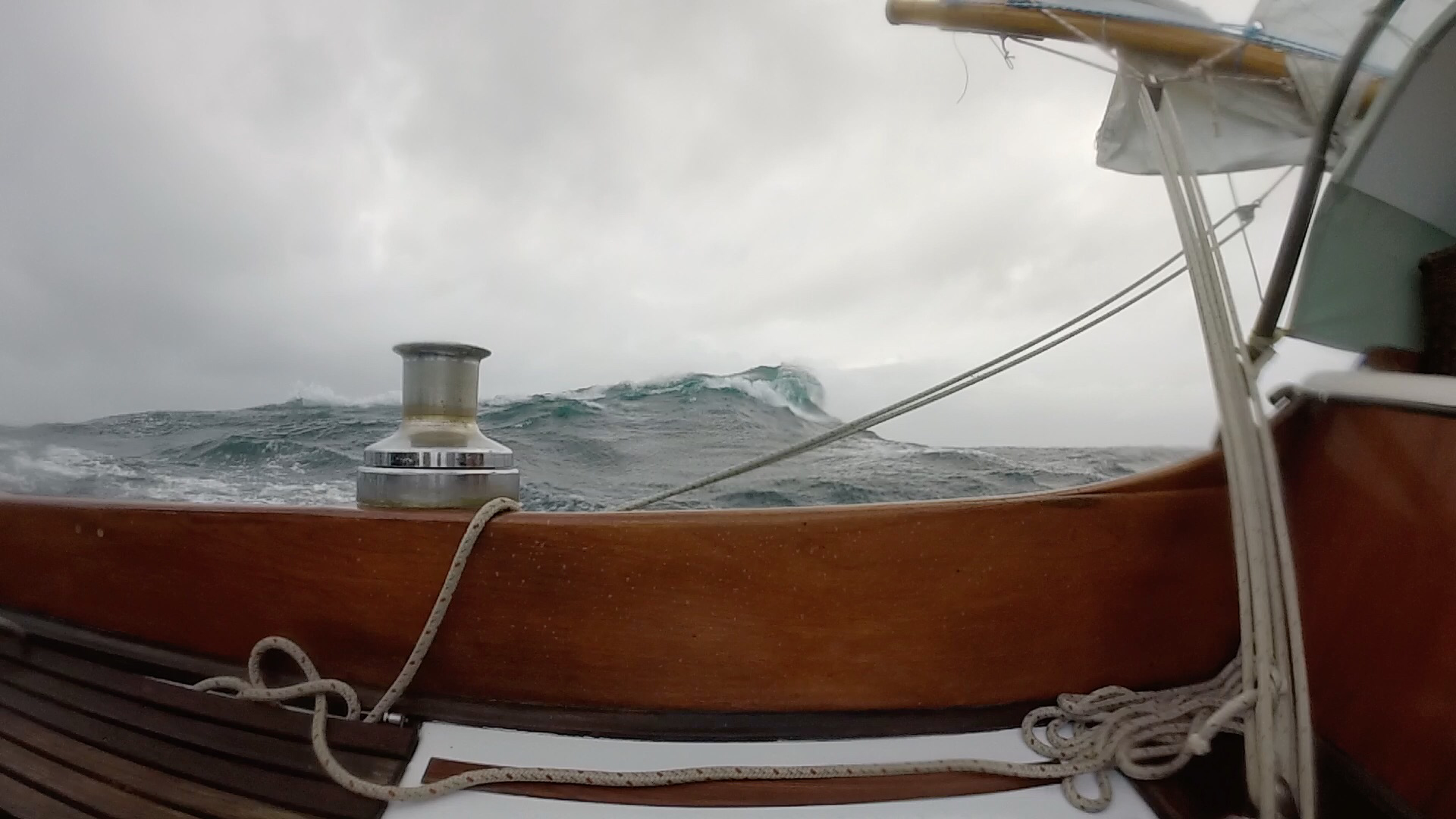The occasional pest, however, came from an odd angle, hitting with a thud, followed by a suspended silence as the sheet of water soared through the air, and finally shattered on the cabin top or cockpit. Worse was the unrelenting bully who succeeded in skidding us sideways, as the helmsman fought and groaned to keep the wheel in place.