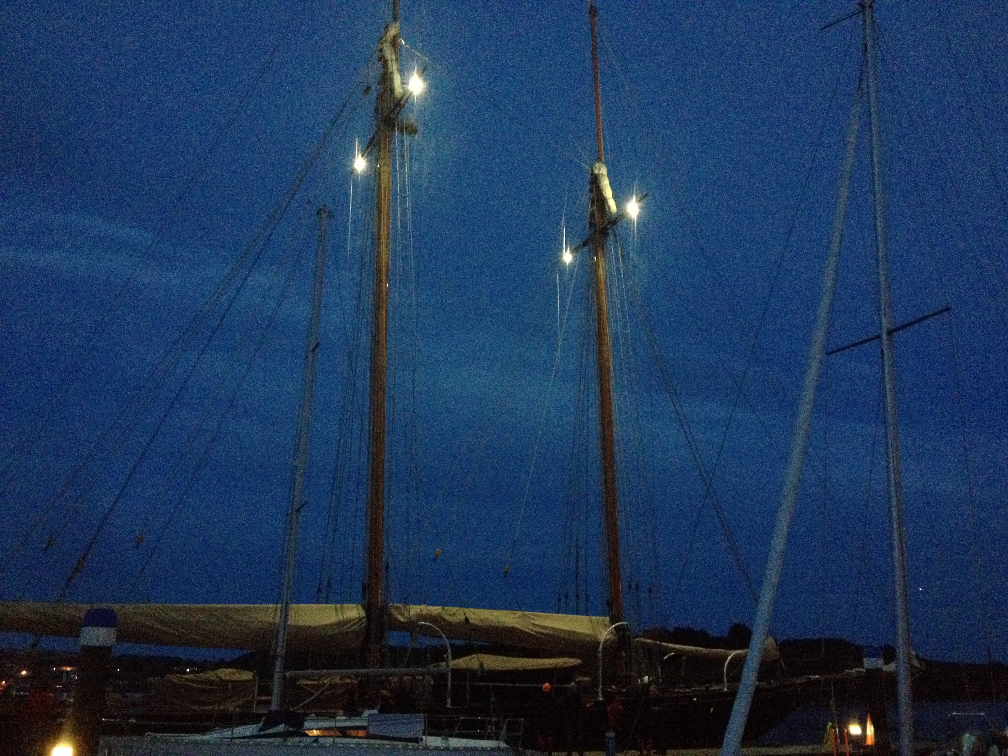 But as I raised my eyes to the sea, my grin fell open into a wide mouthed stare. “Whoaaaa,” I whispered, looking up and up at three grand wooden masts standing right before me. At their tops, glowing mast lights spilled soft light back down to 140ft of sweeping varnished teak and a dark blue hull. Sometimes the beauty of a thing can blast all worries from your mind. I stood gaping at Mariette, the 1915 Herreshoff schooner who had just arrived an hour ago. Perfectly timed to surprise and stun me into much needed mood-lifting awe. She came from the states as well, traveling south as we had gone north to avoid the giant low pressure system.