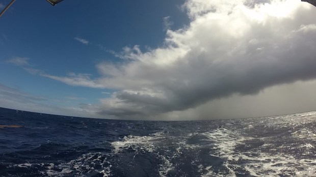 It eventually imploded and disappeared. The windy wall of the squall hit fierce, leaning the boat over for a minute, and then died into a downpour so heavy that we were soaked in seconds, with no bimini covering the cockpit. We bathed our bodies and washed all of our clothes in the buckets that were filling in seconds, water rushing through hose led from the cabin-top gutters.