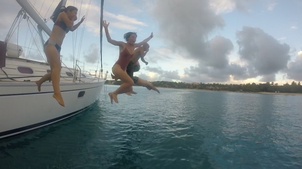 Customs, anchor, and finally, run to the back of the boat and leap out horizontal, flopping down, breaking through the surface of the water, as the warm, clear, calm ocean folds back over me. We laugh, we hug, we jump off the boat, and then we swim to shore, to the gentle beach lined with humble hotels. I point out the Manchinelle tree with the sign warning of it’s toxicity. “Do not stand under this tree in the rain.”