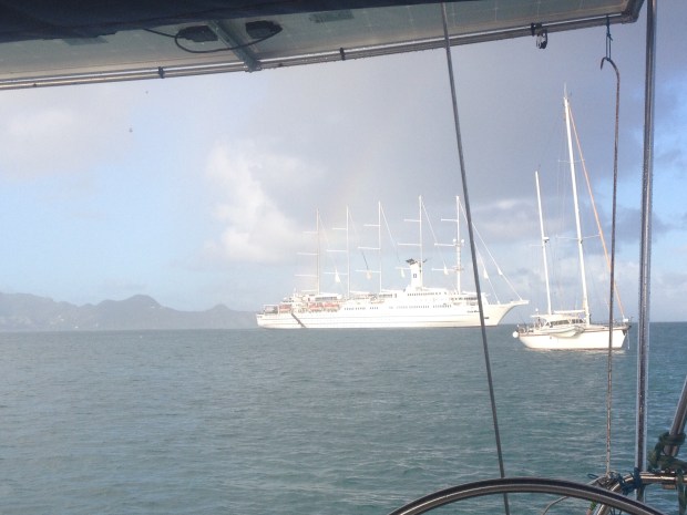 Just after sunrise I opened my eyes from my cockpit nest to see a massive ship creeping in to lay its thundering anchors out beyond the other sloops and ketches. Five symbolic masts stuck awkwardly in its top like candles in a gaudy wedding cake and small, vestigial jibs suggested some sort of sailing ability. On the side it read Club Med 2. An ugly beast. A cruise ship from Martinique.