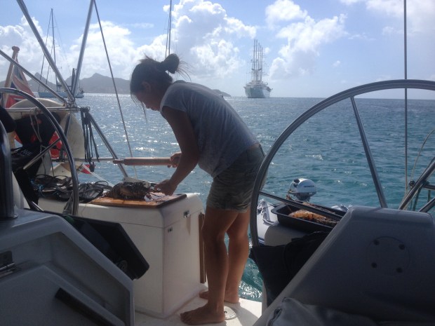 I stayed behind and bullshitted with Luci and the Polish boys, grateful for the levity of our boat. They called a launch over to ask the lobster prices, and bought five and a half pounds for $40. Luci set to work butchering and baking them in garlic butter.