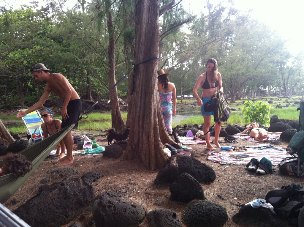 Nikki charged ahead with her determined stride, her puff of frizzy hair bobbing as she lead us along the water to the river mouth, and the tumble of smooth stones that made a small beach. I never hung out there. I always just went right from my car to the water and back to my car. But a cluster of our friends had camped out on the far end of the beach, past a few families with boogie boards. Hawaiians loved to be outdoors. We marched over and settled our boards and towels and snack among the empire of blankets and coolers spreading out from our crew.