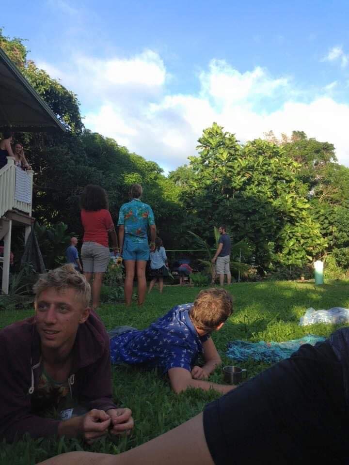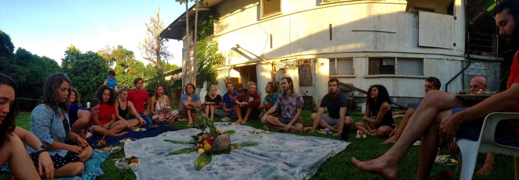 A small group set to work foraging decorations and designing a ceremonial space for the meal. I monitored the oven, and washed dishes as they were made. Jessie darted through the crowd with her little silver video camera, capturing our friends in their awkward moments. Blankets were spread in the yard, between the mango and avocado trees, avoiding ant hills. The right woman for the job (Christina;) found the computer and made the after-party playlist. And for everyone left without a task, there were coconuts.