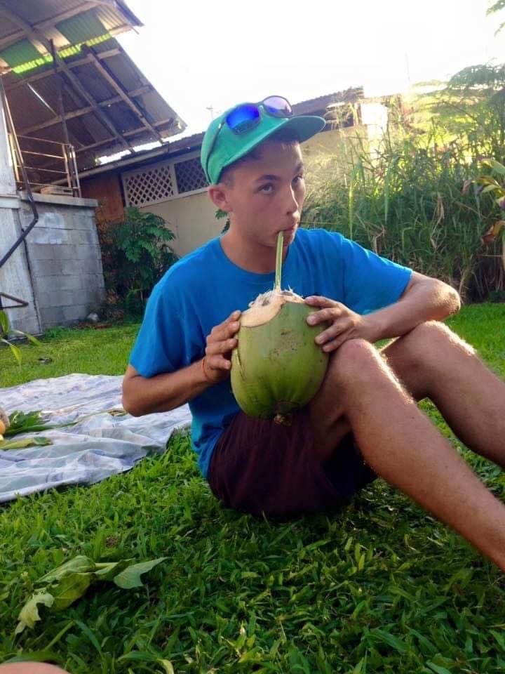 Our rock-climber colleague Gretchen wandered into the yard, from where she’d parked her purple Ford truck, (her home for the year), carrying a box of green coconuts. She smiled her big-toothed smile, high off adventure, adrenaline (and maybe venom), as she showed us the angry red bites covering her thin brawny arms. The tropical toll of the tree she had just climbed to bring us her contribution to the meal. Then she set to work handing out cocos, teaching machete skills, and plucking the hollow-stemmed papaya leaves to use as straws. Adults became giddy jungle kids as they crouched in the yard and sipped from nature’s soda fountain.